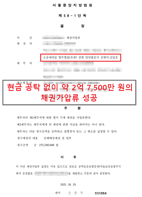 - 서울중앙지방법원은 이러한 김현덕 민사팀의 신청을 받아들여 현금 공탁 없이 가압류 결정을 하였습니다.